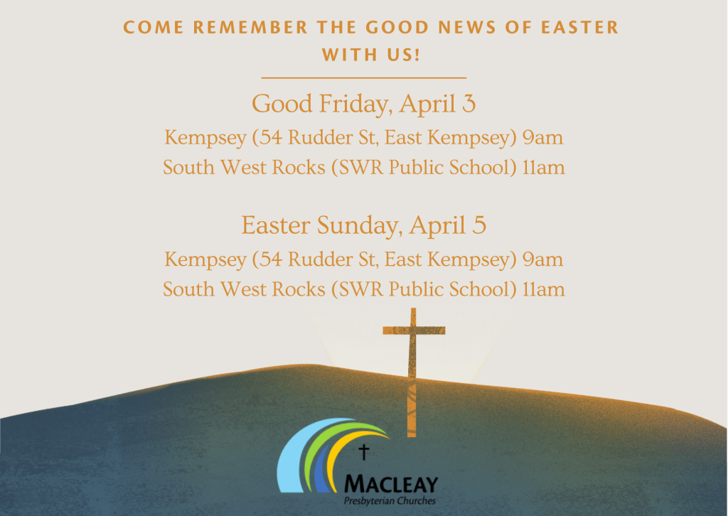 Our warm-and-welcoming South West Rocks church family meets every Sunday 11am at the South West Rocks Public School Hall (62 Gregory St). We offer a kids program during term time and would love for you to join us as we enjoy each other’s company and of course delight in God.